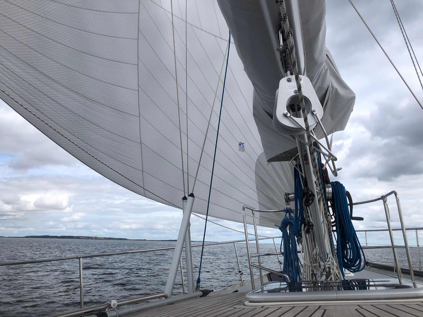 Van de totale tocht motoren we zo’n 9 uur van de 50! Een langzame doch relaxte tocht. De laatste uren lopen we met uitgeboomde genua (met de kotterboom) zo’n 6,5’ op de windvaan, zon in de kuip, muziek en mooi boek! Genieten.