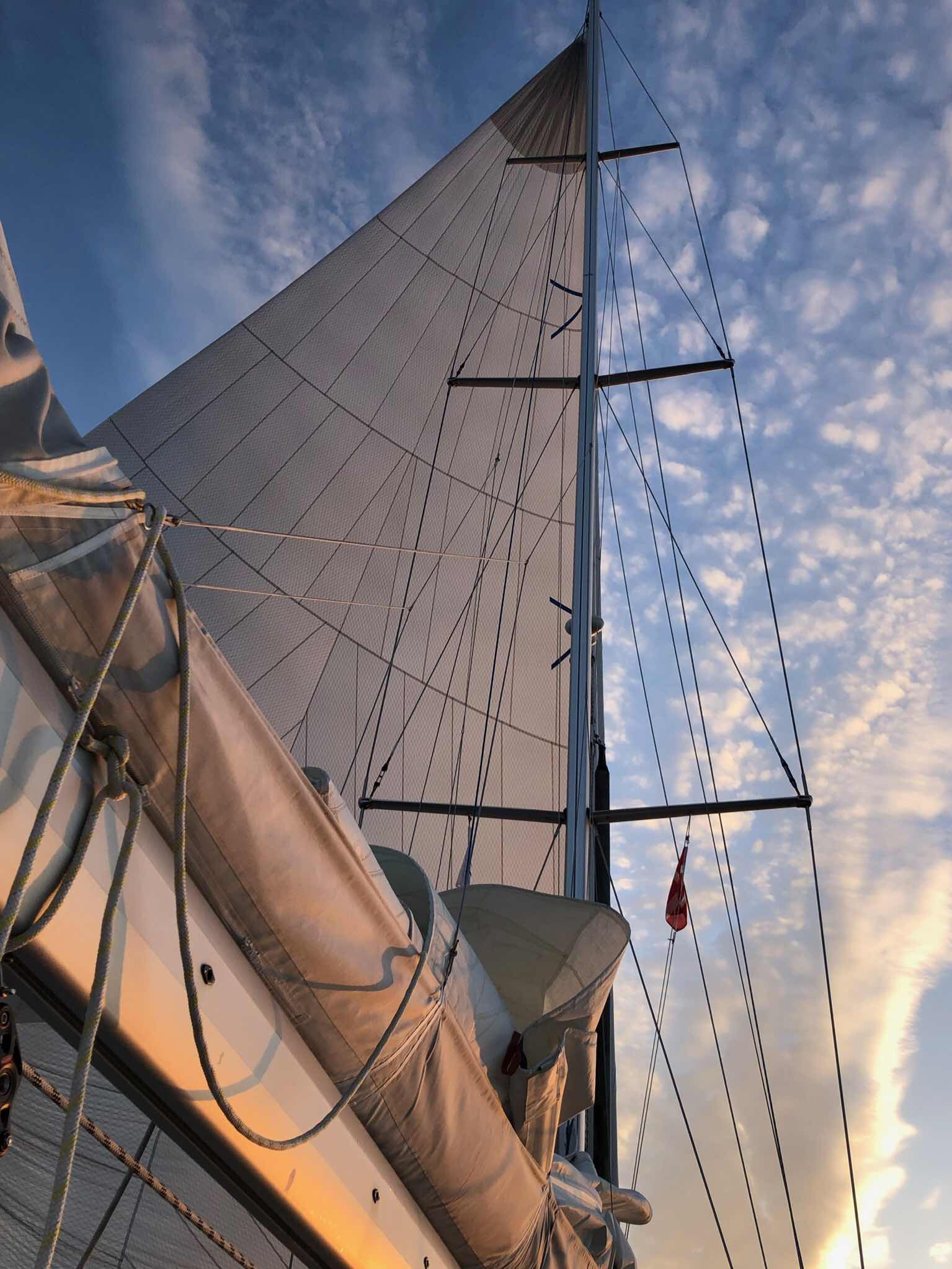 Van de totale tocht motoren we zo’n 9 uur van de 50! Een langzame doch relaxte tocht. De laatste uren lopen we met uitgeboomde genua (met de kotterboom) zo’n 6,5’ op de windvaan, zon in de kuip, muziek en mooi boek! Genieten.