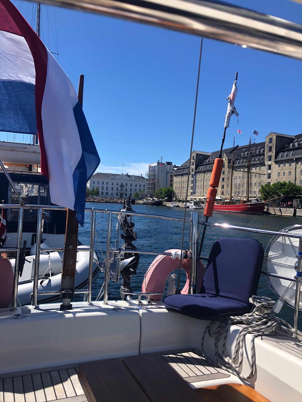In Kopenhagen ontmoeten we Dick en Robin Alewijnse die er met hun schip Aline liggen en nu zoon en schoondochter Joost en Pien te gast hebben. De Aline is te koop en ze hebben deze ochtend en proefvaart gemaakt met een potentiële koper. Spannend.... Ze zijn net binnen als wij de Amalien-haven invaren. De proefvaart was succesvol en de plek draagt zeker bij aan de sfeer die nodig is om verliefd op een schip te worden, we duimen. Een geweldige plek, voor de opera en midden in de stad. In feite meren wij af tegen een gloednieuwe parkeergarage. De zijkant van het dak is de kade waaraan wij vastleggen. En het dak is een grote chillplek voor de inwoners en toeristen. Er wordt geflaneerd, er staan eettentjes, jong en oud iedereen wandelt langs, maar ze komen ook met standstoelen, handdoeken en er wordt zelf gezwommen.