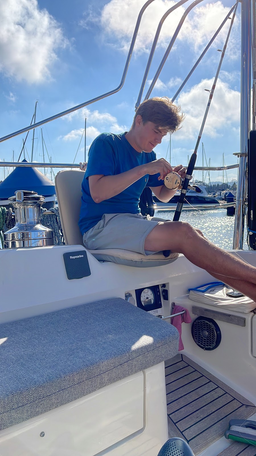Na de chil-tijd werd er gevist, gelezen, RVS paal gemonteerd van de hydrovane windvaan en de andere ‘zaken’ vanuit de bus naar de boot gebracht. Handig zo’n koerier.